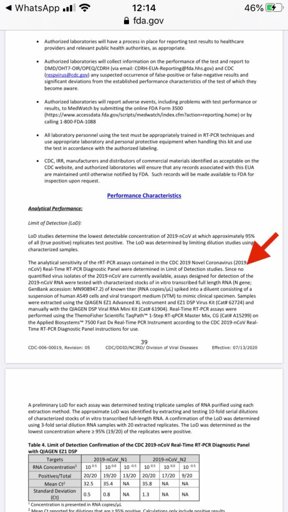Here is the CDC’s 2019-Novel Coronavirus (2019-nCoV) Real-Time RT-PCR Diagnostic Panel dated July 13, 2020. Page 39 from the fda.gov website stating: