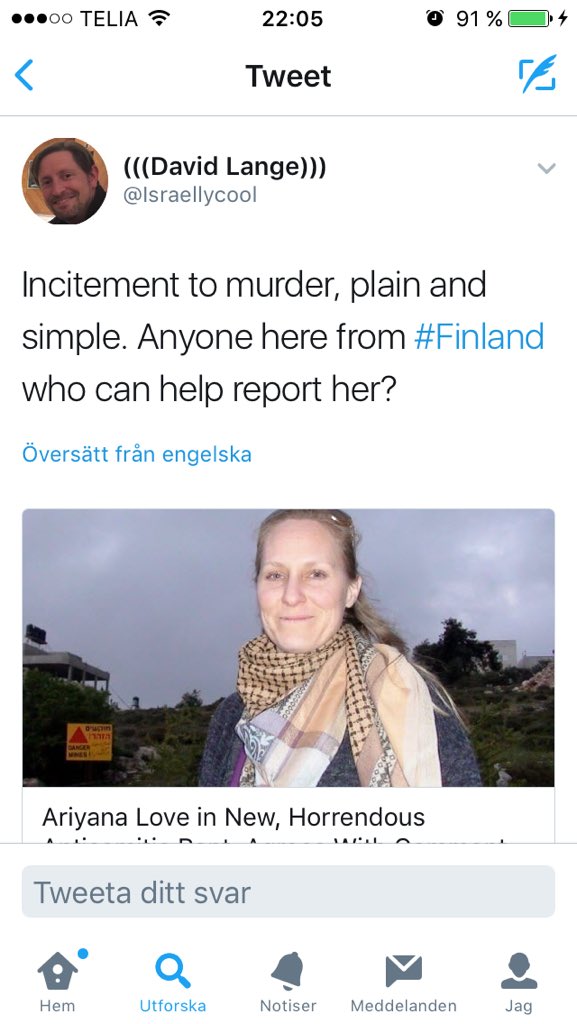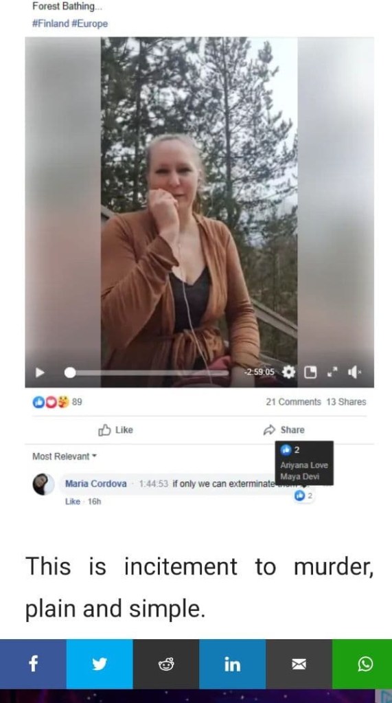 Here’s how Lange’s online defamation works. He takes screenshots of comments on posts that I make, then publishes them into blogs and makes up false stories with the material. In this blog, Lange is recruiting his Zionist followers to harass me, instructing them to contact the Finnish authorities and report me for “ethnic agitation” and “incitement to murder”. Isn’t that what Lange and his co-workers do?