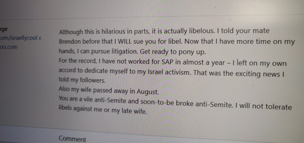 Lange goes way beyond just online harassment and cyber assaults. He’s targeting people’s income. In the screenshot below, Lange admits to assaulting me financially. He left this comment under my first blog, where I was defending myself from his attacks, in 2020. Lange admits to working for SAP Israel and says he hasn’t worked there for a year. His assaults against me began in February 2018. This means Lange was working for SAP Israel while targeting me for at least one year.