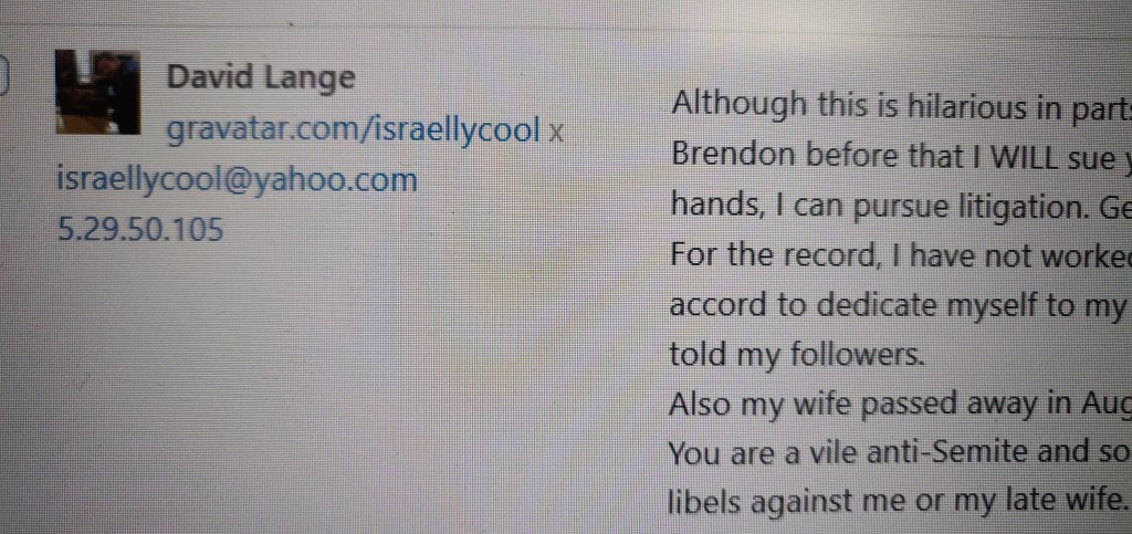 You can also view Lange’s extensive harassment and the dozens of defaming blogs he’s written about me, here.