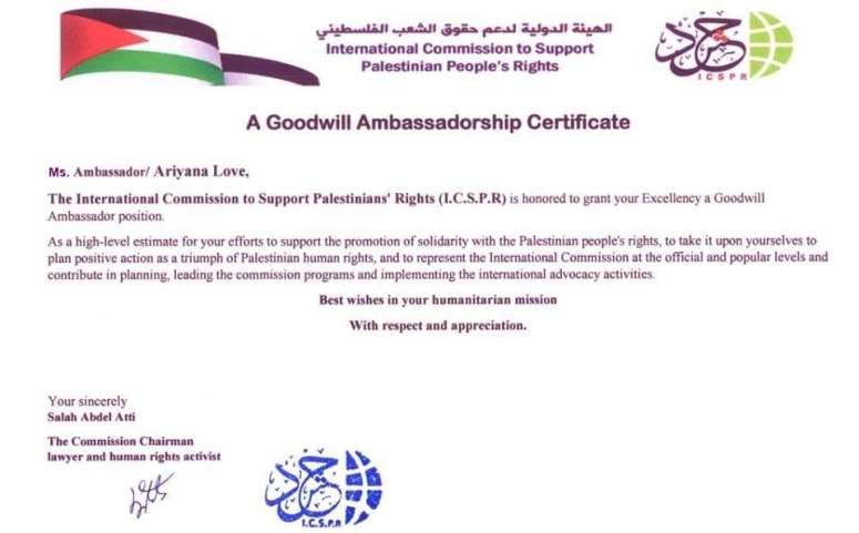 The Palestinian Authorities (PA) and the Gaza authorities awarded me the title of Goodwill Ambassador to Palestine through the International Commission to Support Palestinian Rights (ICSPR) in 2018. This official honor was bestowed on me after years of working with Palestinian media professionals and defending Palestinian human rights.