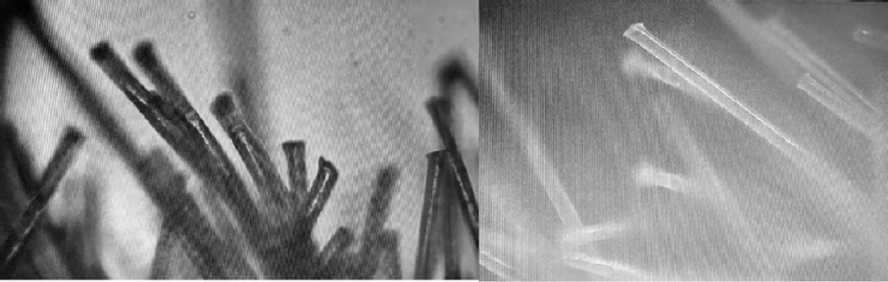 Figure 4 and 5 Broken-shaped ends – their task is to disrupt the epithelium (surface layer) on the mucosa, thereby also their breakage and subsequent leaching of the fiber content – Darpa Hydrogel and Lithium. The threads are patented [by Darpa].