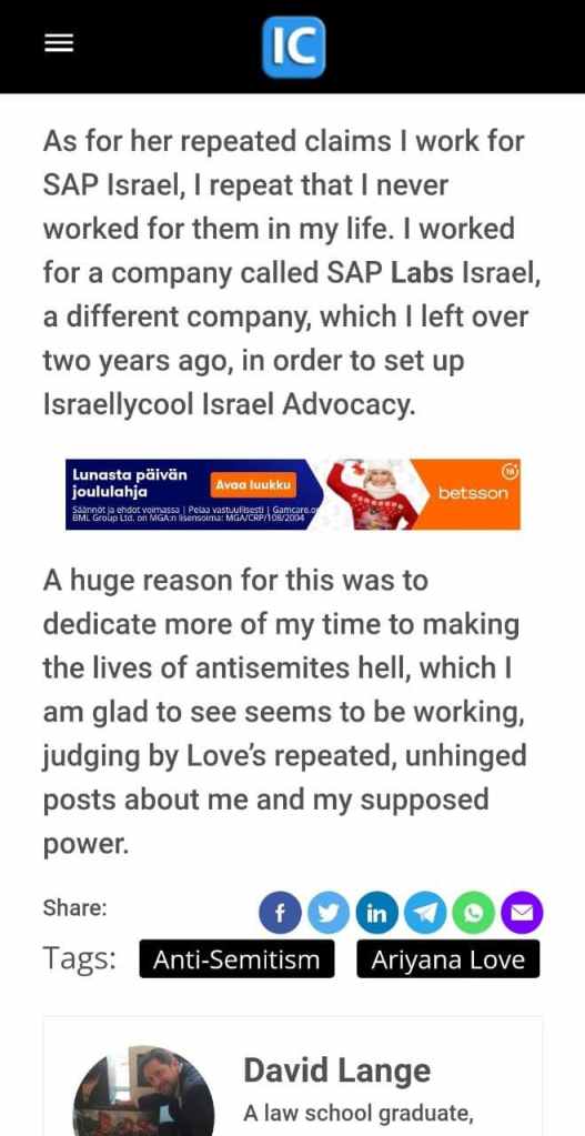 SAP Israel’s website “israellycool.com” has written 20 libelous public blogs accusing me of hating Jews and of anti-Jewish speech, which is a vicious lie. Now, SAP Israel employees are stalking me on Telegram, the only platform where I feel safe from Israeli state predators like David Lange.